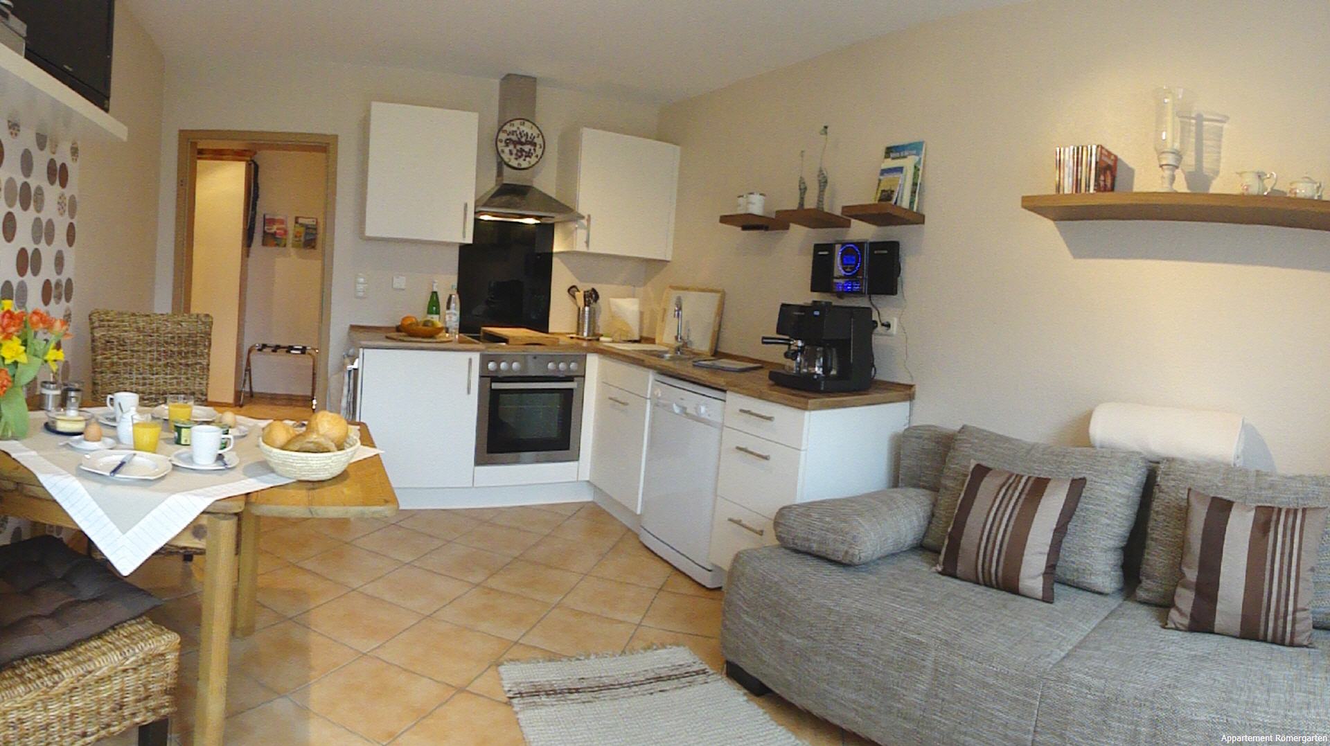 Im Wohnraum finden Sie eine komplett eingerichtete Küche, einen Essplatz für 2 Personen, gemütliches Sofa, Fernseher, DVD-Player und Stereoanlage. Ihr 1. Urlaubsfrühstück halten wir bei Anreise für Sie im Kühlschrank bereit.